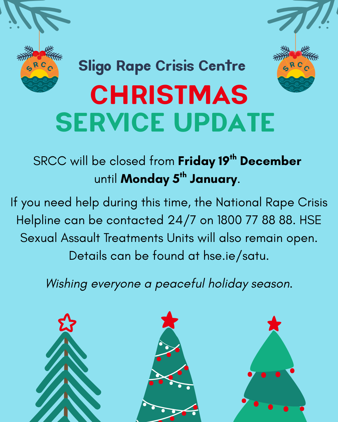 SRCC will be closing for the Christmas period from Friday 19th December. The centre will reopen on Monday 5th January 2026. If you need help during this time, the National Rape Crisis Helpline can be contacted 24/7 on 1800 77 88 88. HSE Sexual Assault Treatment Units will also remain open. Details can be found on hse.ie/satu